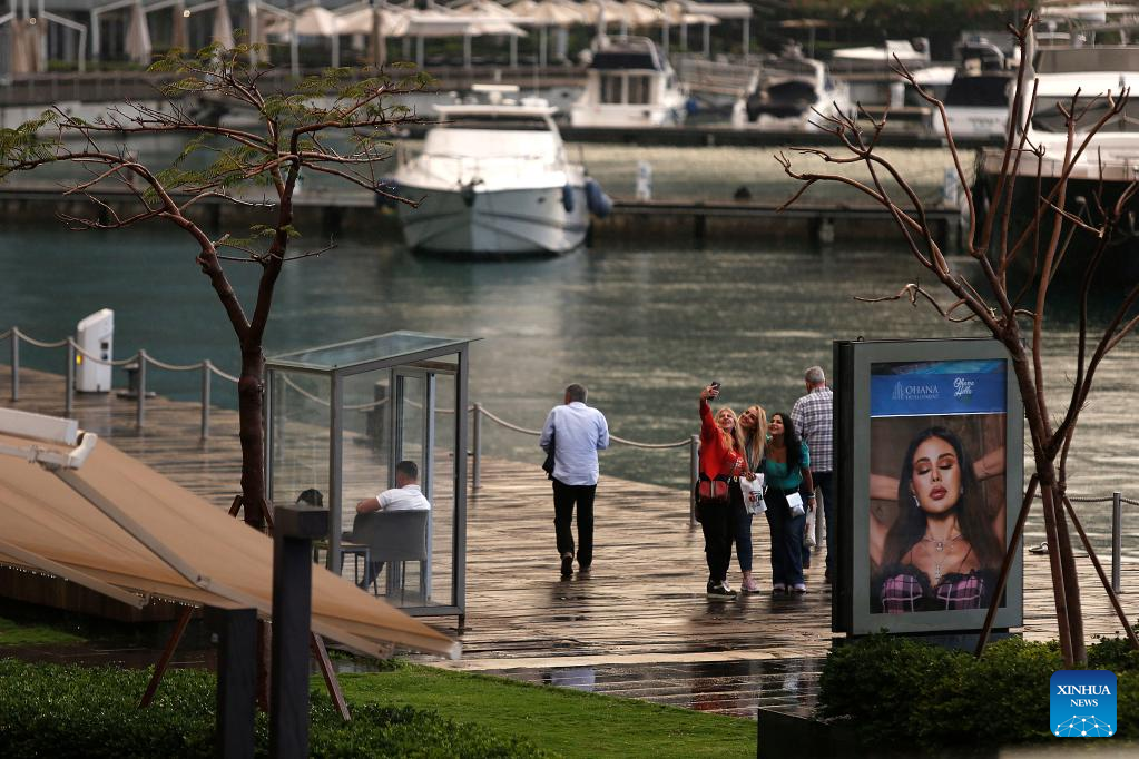 Pedestrians take a selfie by the water in Beirut, Lebanon on Nov. 2, 2022. (Xinhua/Bilal Jawich)