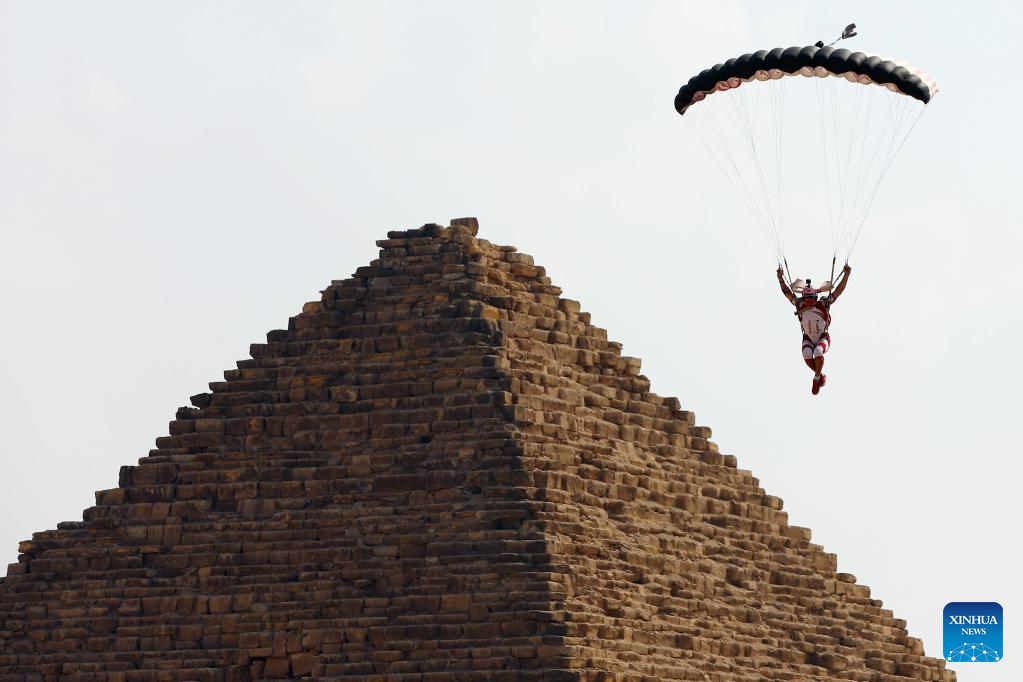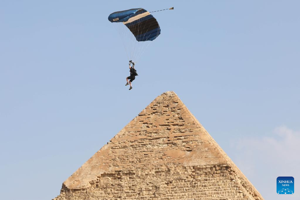 A skydiver flies by pyramids during the skydiving festival "Jump Like a Pharaoh" in Giza, Egypt, on Nov. 2, 2022. (Xinhua/Ahmed Gomaa)