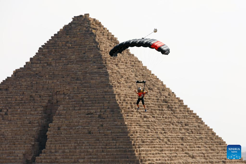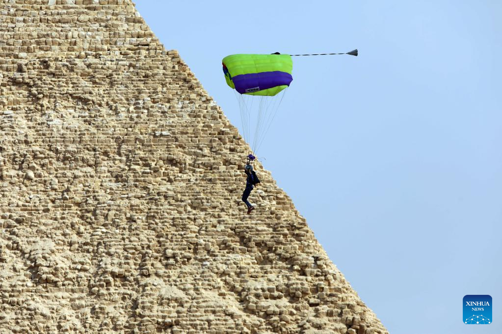 A skydiver flies by a pyramid during the skydiving festival "Jump Like a Pharaoh" in Giza, Egypt, on Nov. 2, 2022. (Xinhua/Ahmed Gomaa)