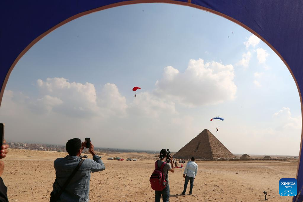 People watch the skydiving performance by jumpers over pyramids during the skydiving festival "Jump Like a Pharaoh" in Giza, Egypt, on Nov. 2, 2022. (Xinhua/Ahmed Gomaa)