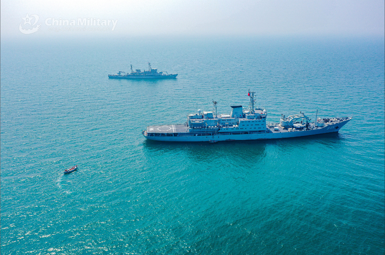 Two ships participate in a visit, board, search, and seizure (VBSS) training course during a real-combat rescue exercise on October 8, 2022, which was jointly carried out by a salvage ship flotilla and a naval aviation regiment under the PLA Northern Theater Command. (eng.chinamil.com.cn/Photo by Ma Yingming)