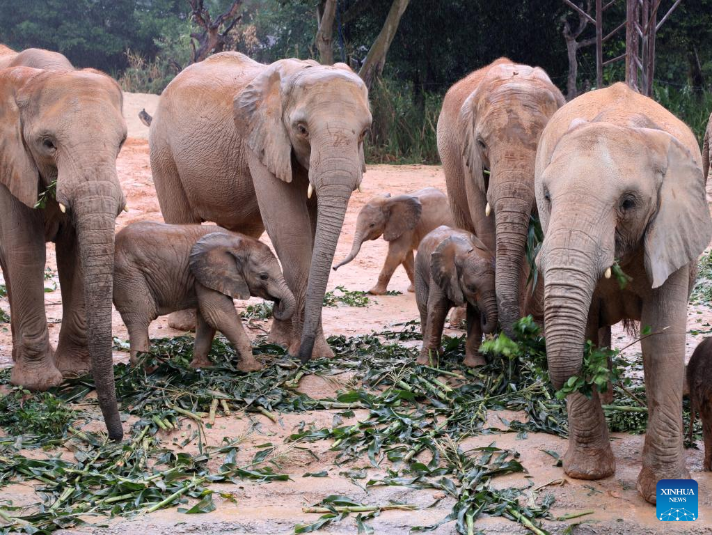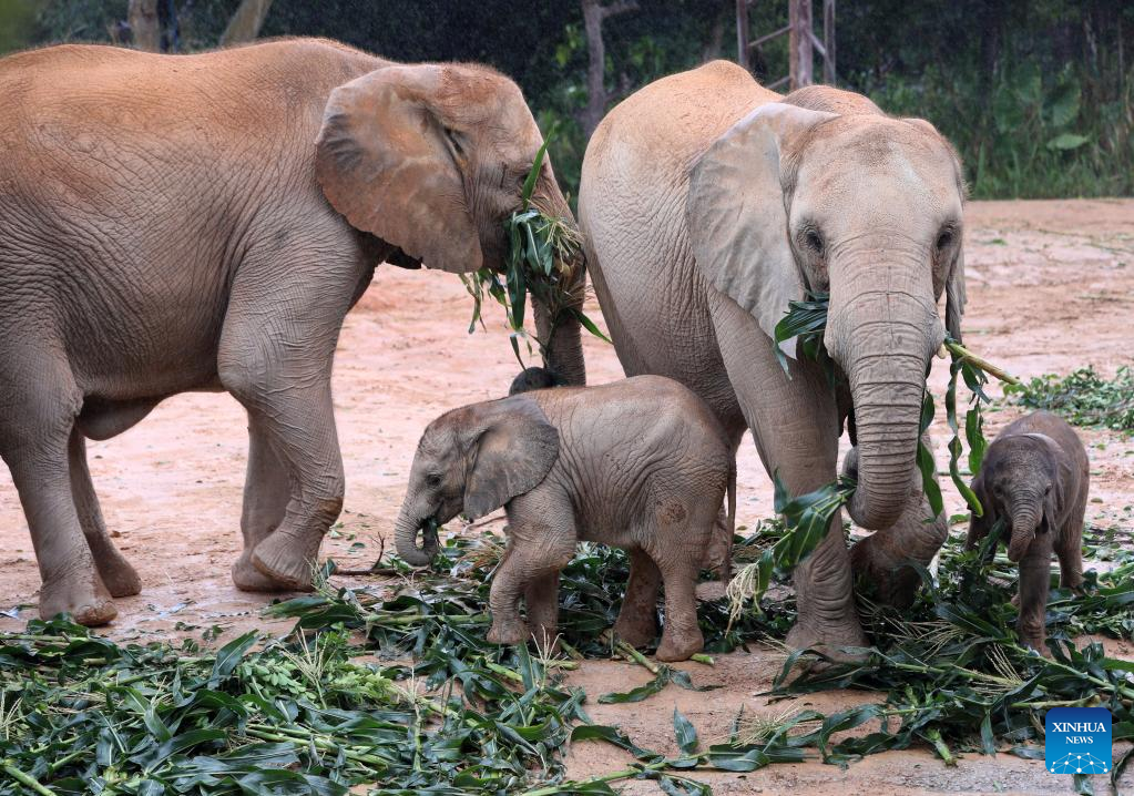 Three African elephant calves eat at the Chimelong National Ex-situ Conservation Base of World Endangered Wild Plants and Animals in Qingyuan, south China's Guangdong Province, Nov. 3, 2022. Five African elephant calves had been born at the base from May to October this year. All of them are now in good health. (Xinhua/Huang Guobao)