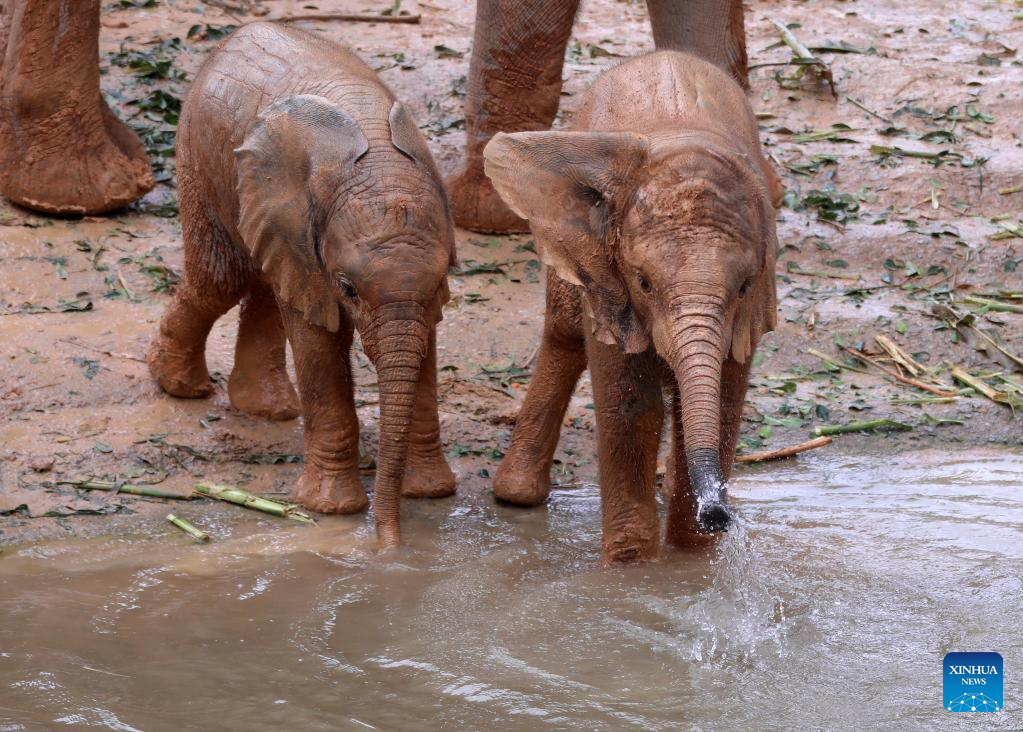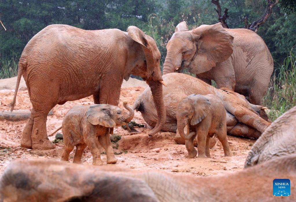 Two African elephant calves play at the Chimelong National Ex-situ Conservation Base of World Endangered Wild Plants and Animals in Qingyuan, south China's Guangdong Province, Nov. 3, 2022. Five African elephant calves had been born at the base from May to October this year. All of them are now in good health. (Xinhua/Huang Guobao)