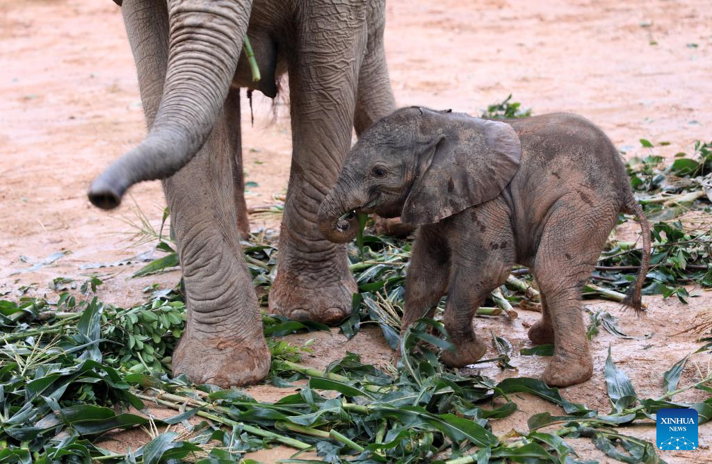 An African elephant calf eats at the Chimelong National Ex-situ Conservation Base of World Endangered Wild Plants and Animals in Qingyuan, south China's Guangdong Province, Nov. 3, 2022. Five African elephant calves had been born at the base from May to October this year. All of them are now in good health. (Xinhua/Huang Guobao)