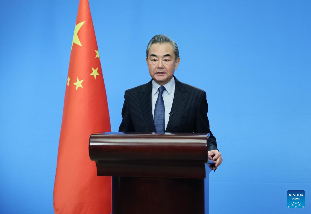 Chinese State Councilor and Foreign Minister Wang Yi delivers a speech via video at the opening ceremony of a symposium on global maritime cooperation and governance, Nov. 3, 2022. (Xinhua/Yao Dawei)