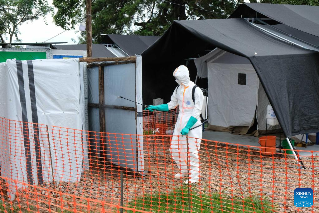 A man disinfects facilities at an isolation center in Mubende district, Uganda, Nov. 1, 2022. The Ministry of Health figures showed that as of Oct. 26, the country has registered 115 confirmed Ebola cases, 32 deaths since the outbreak was announced on Sept. 20. (Photo by Hajarah Nalwadda/Xinhua)