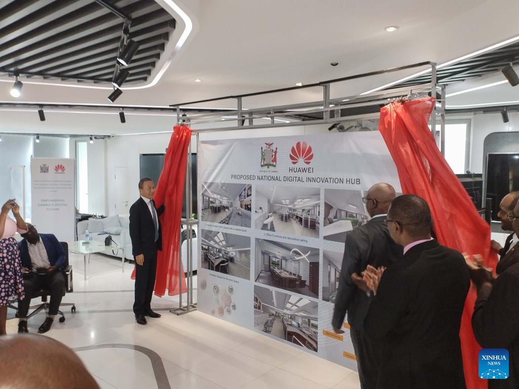 Huawei's Vice President for Southern Africa Region Phil Li (2nd L) and Zambian acting Minister of Education Elijah Muchima (3rd L) unveil the visual designs of the forthcoming National Digital Innovation Hub during the launch of an information communication technology (ICT) fund in Lusaka, Zambia, on Nov. 3, 2022. Chinese telecommunications giant Huawei on Thursday launched the information communication technology (ICT) fund to develop innovation leaders to accelerate Zambia's digital transformation agenda. (Xinhua/Martin Mbangweta)