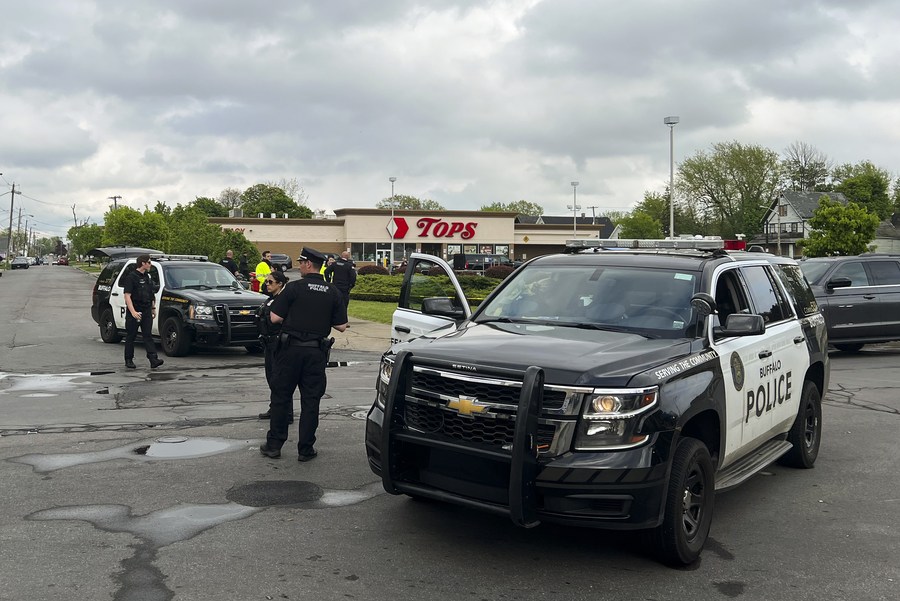 Police work near the scene of a mass shooting in Buffalo of New York State, the United States, May 16, 2022. (Photo by Zhang Jie/Xinhua)