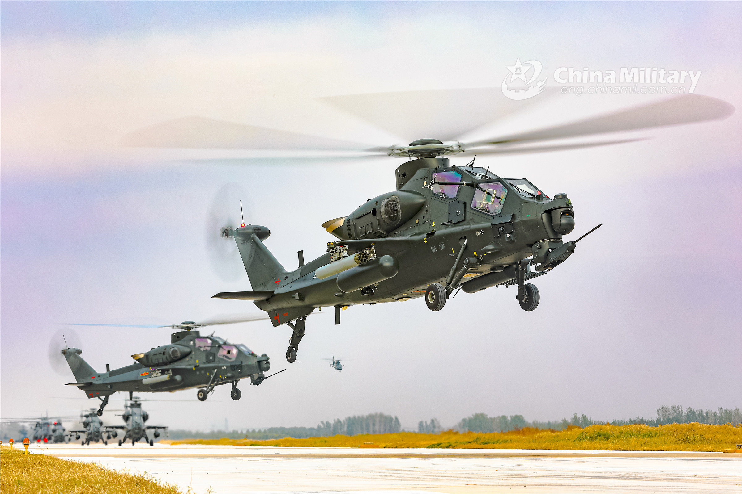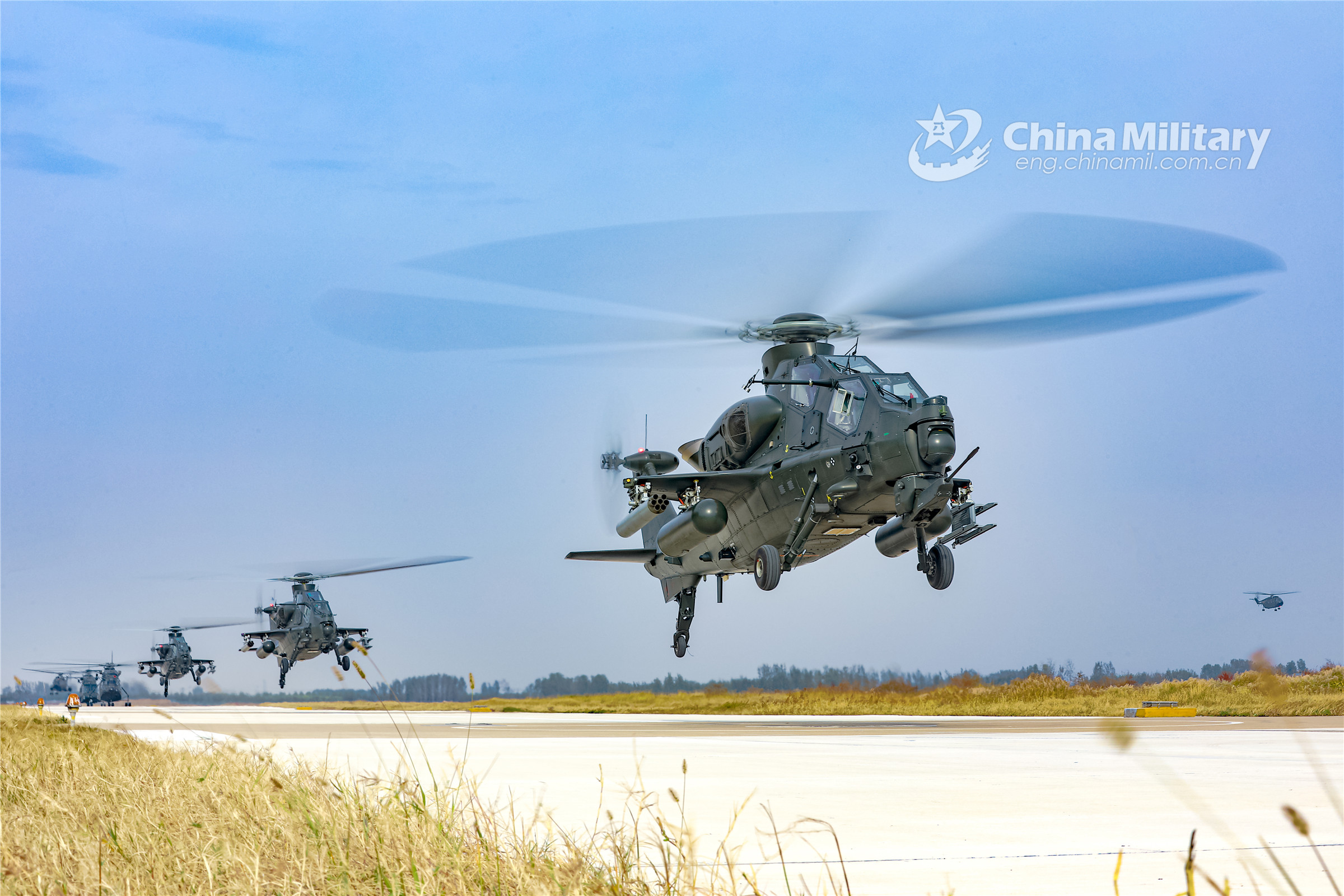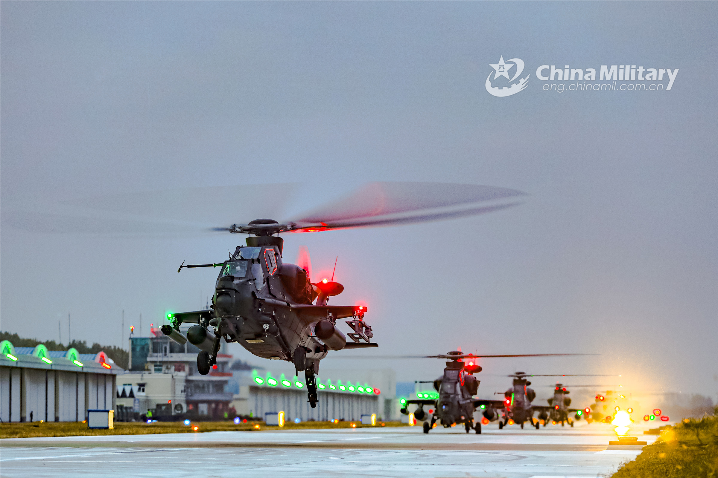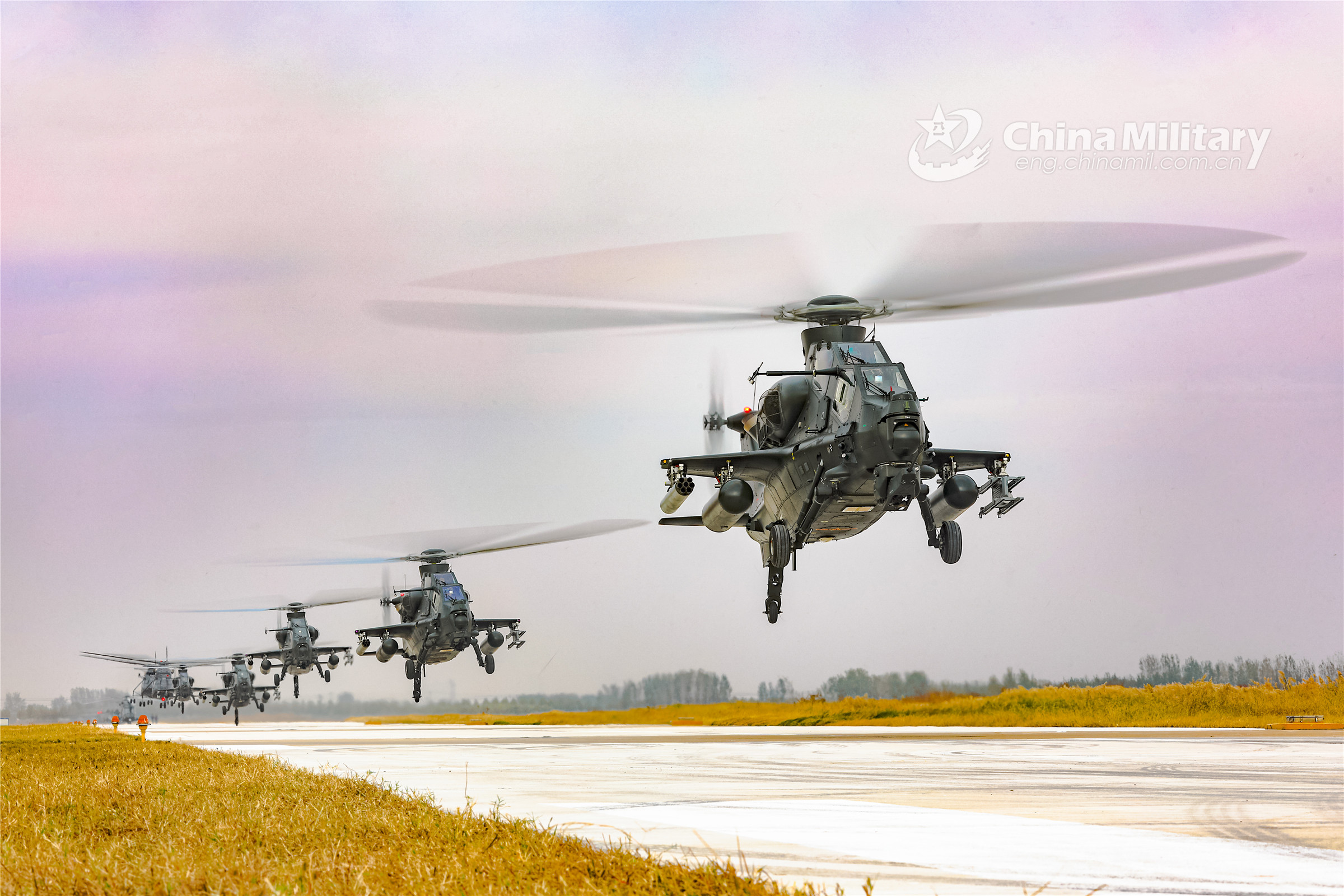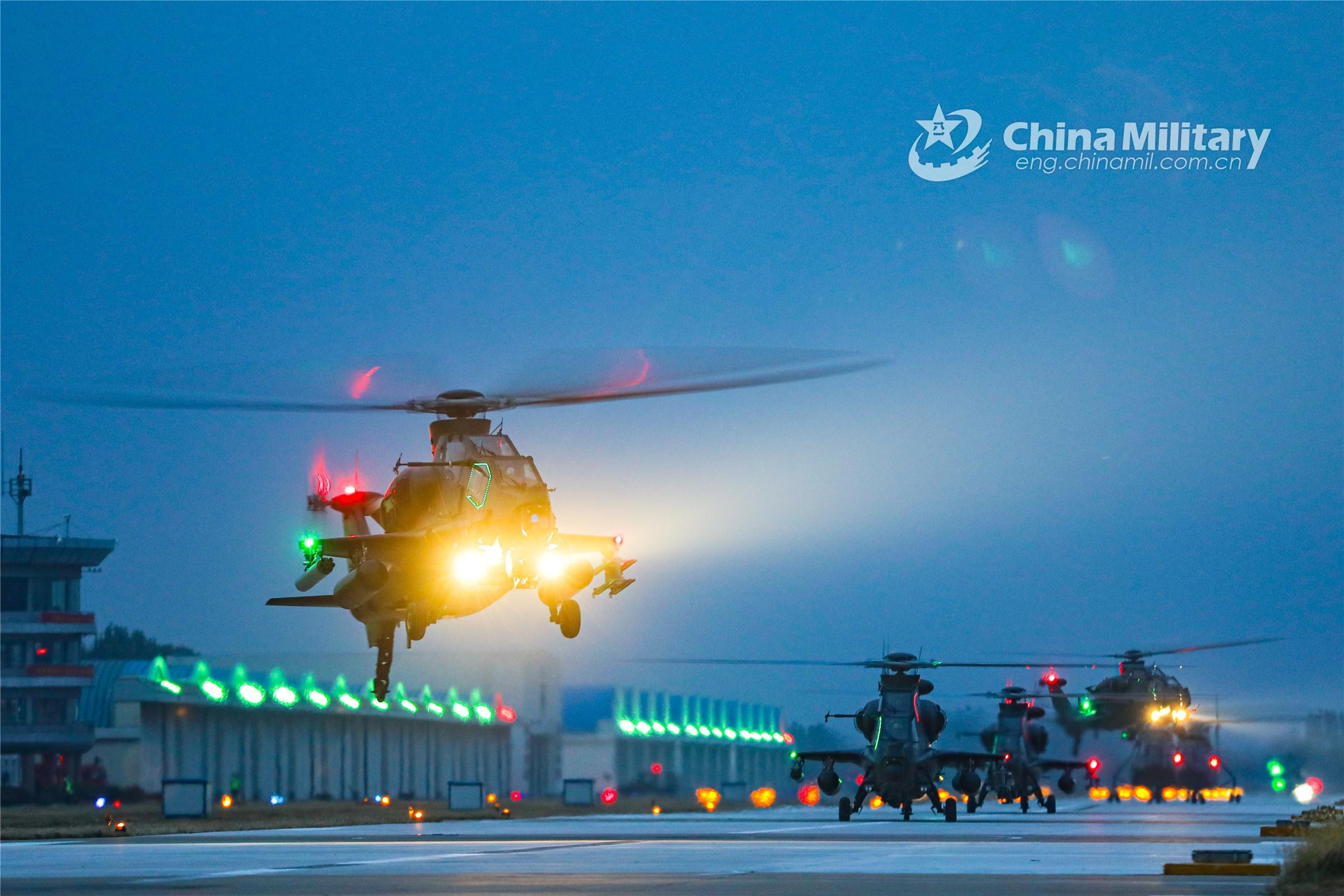 Attack helicopters attached to an army aviation brigade under the PLA 80th Group Army take off from the runway successively during a round-the-clock flight training exercise on October 25, 2022.(eng.chinamil.com.cn/Photo by Li Peng)