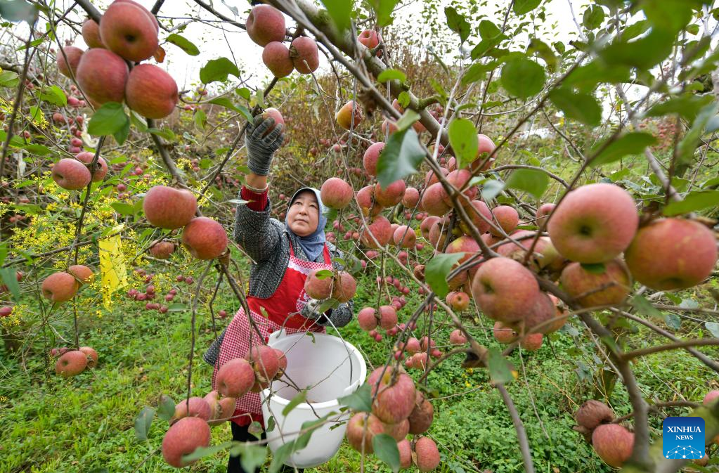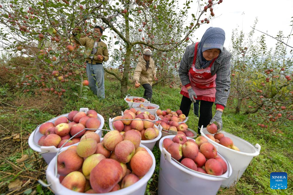 Farmers pick apples at an orchard in Niupeng Township of Weining Yi, Hui and Miao Autonomous County, southwest China's Guizhou Province, Nov. 3, 2022. Weining County, with its natural advantages of high sea-level, low-latitude, long sun-exposure time and large temperature difference in day and night, has developed apple planting that brought wealth to local people. (Xinhua/Yang Wenbin)
