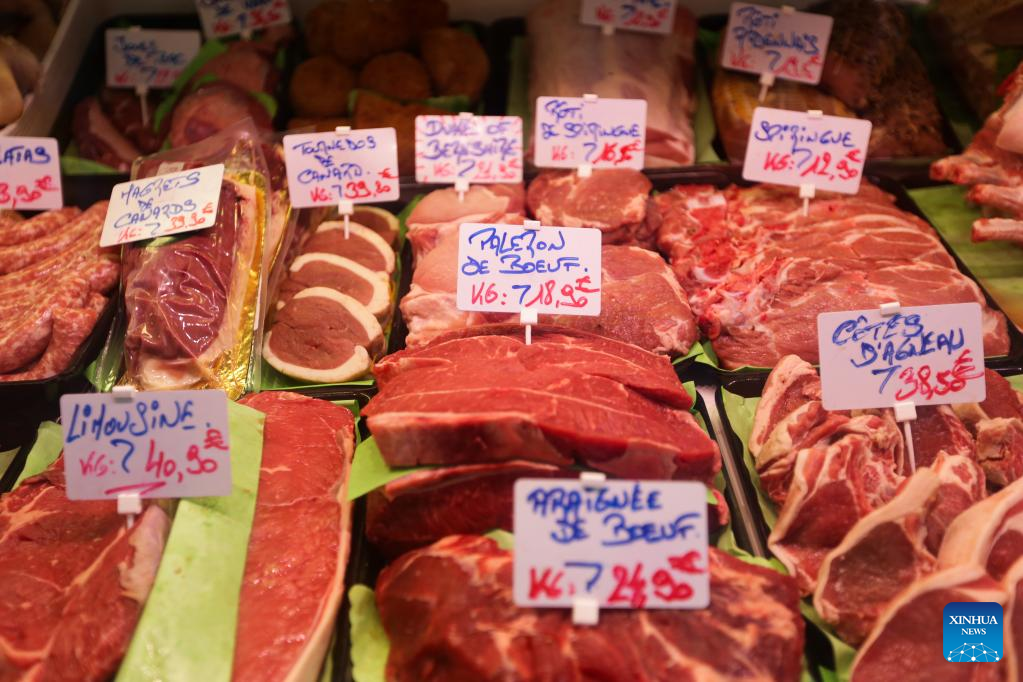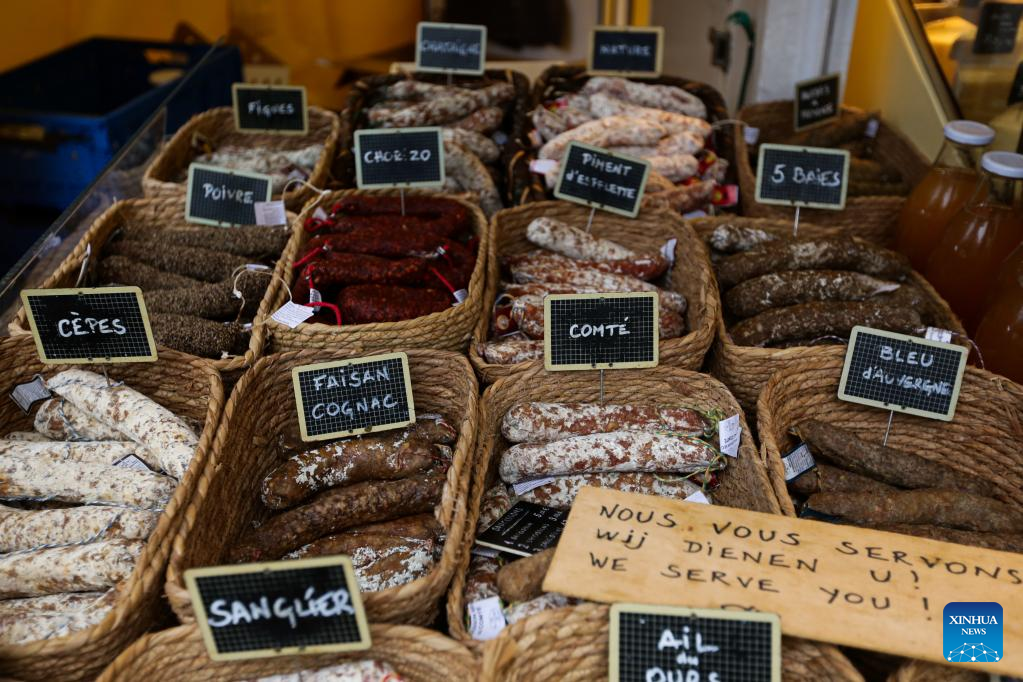 Sausages are seen at a market in Brussels, Belgium, on Nov. 4, 2022. October's year-on-year inflation rate climbed to 10.7 percent in the eurozone, from 9.9 percent in September. (Xinhua/Zheng Huansong)
