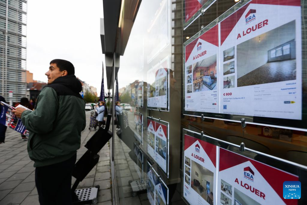 A man stands in front of posters of apartments for rent in Brussels, Belgium, on Nov. 4, 2022. October's year-on-year inflation rate climbed to 10.7 percent in the eurozone, from 9.9 percent in September. (Xinhua/Zheng Huansong)