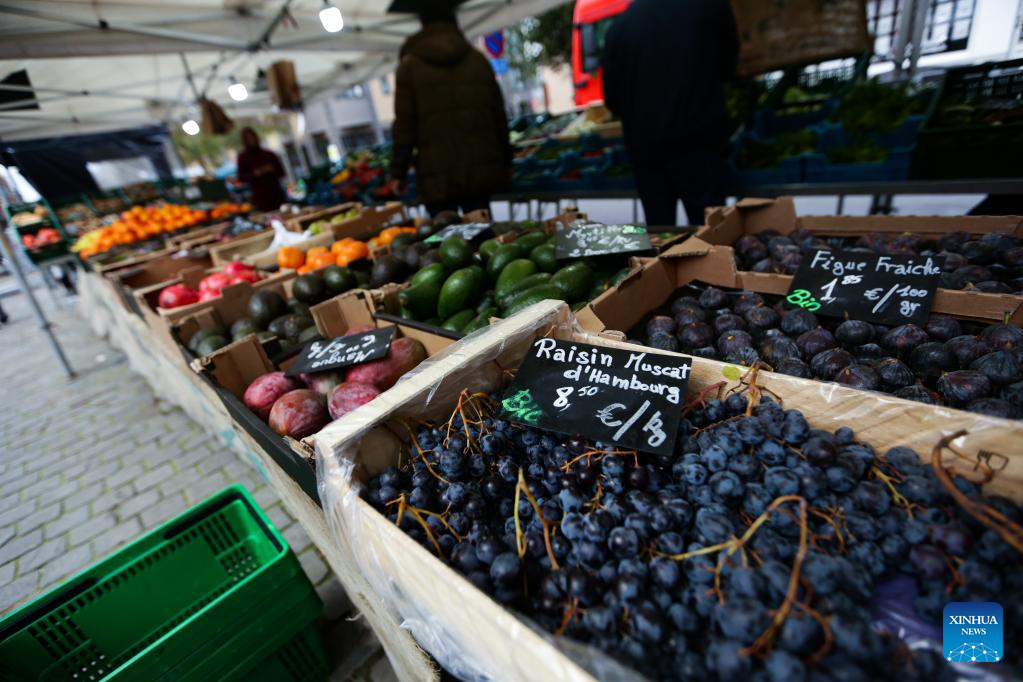Customers shop at a market in Brussels, Belgium, on Nov. 4, 2022. October's year-on-year inflation rate climbed to 10.7 percent in the eurozone, from 9.9 percent in September. (Xinhua/Zheng Huansong)