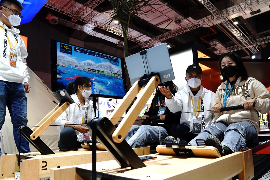 Visitors experience rowing machines at the Consumer Goods exhibition area of the fifth China International Import Expo (CIIE) at the National Exhibition and Convention Center (Shanghai) in east China's Shanghai, Nov. 5, 2022. (Xinhua/Zhang Jiansong)