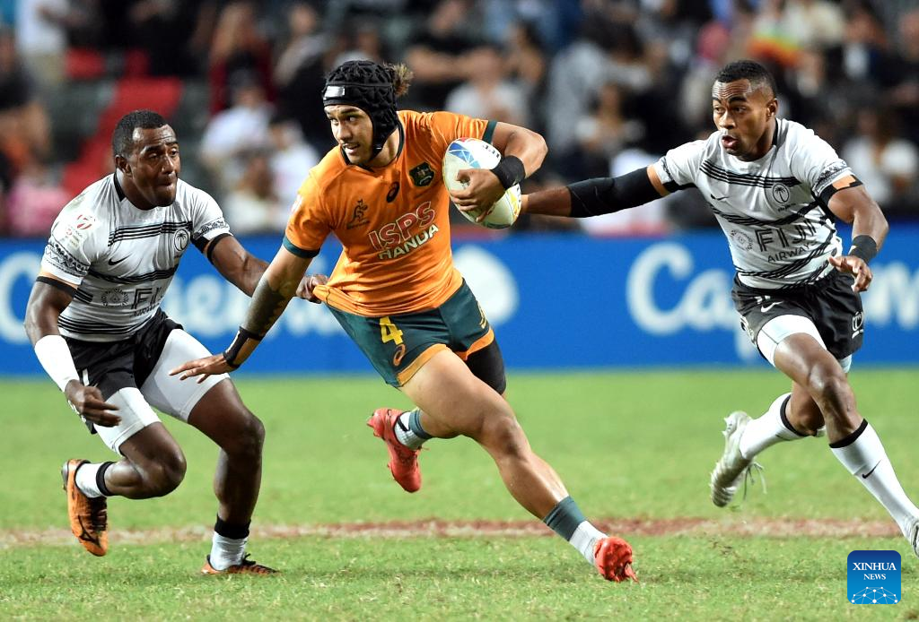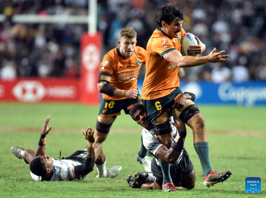 Henry Paterson (1st R) of Australia breaks through during the rugby 7s final between Fiji and Australia at the Cathay Pacific/HSBC Hong Kong Sevens in Hong Kong, south China, Nov. 6, 2022. (Xinhua/Lo Ping Fai)