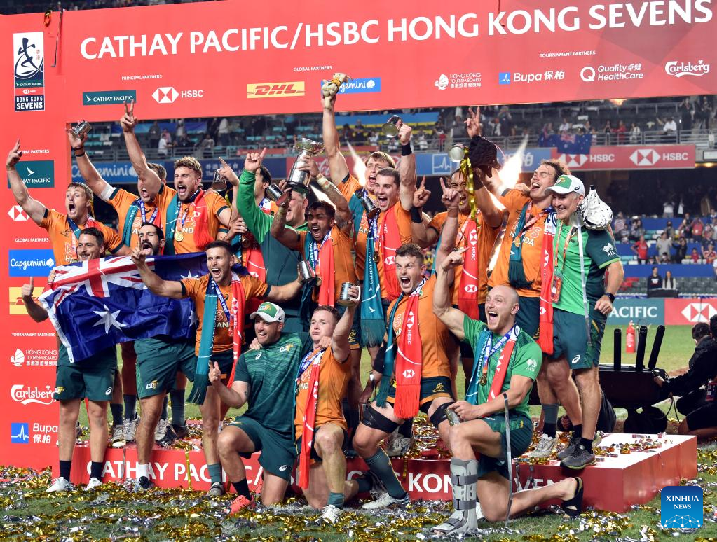 Team members of Australia celebrate with the trophy after the rugby 7s final between Fiji and Australia at the Cathay Pacific/HSBC Hong Kong Sevens in Hong Kong, south China, Nov. 6, 2022. (Xinhua/Lo Ping Fai)