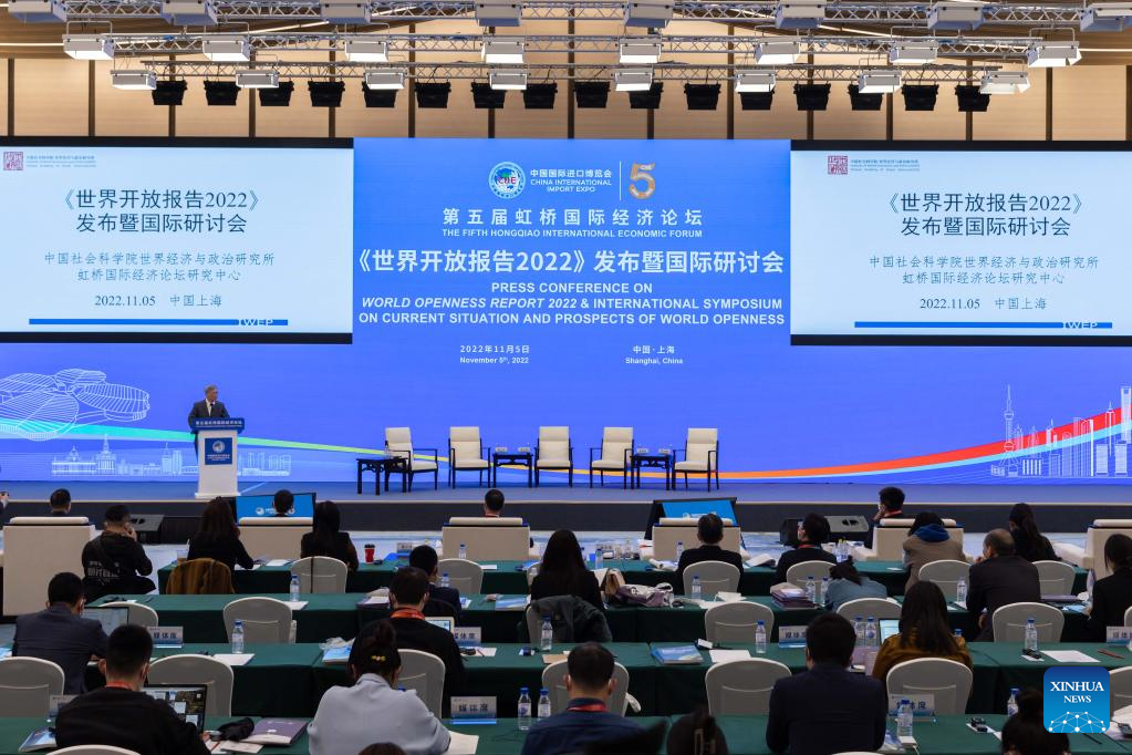 Participants attend the press conference on World Openness Report 2022 &International Symposium on Current Situation and Prospects of World Openness during the fifth Hongqiao International Economic Forum in Shanghai, east China, Nov. 5, 2022. (Xinhua/Wang Xiang)