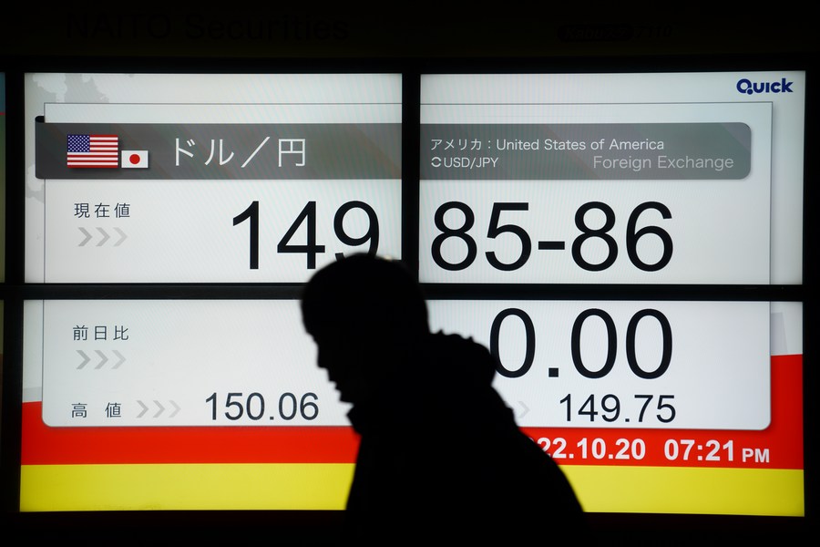 An electronic display shows a real-time exchange rate of the Japanese yen against the U.S. dollar in Tokyo, Japan, Oct. 20, 2022. (Xinhua/Zhang Xiaoyu)