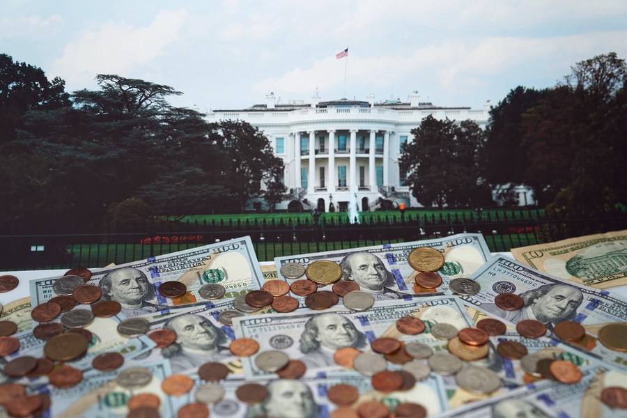 U.S. dollar banknotes, coins and an image of White House are arranged for a photograph in Washington D.C., the United States, on Aug. 20, 2019. (Xinhua/Liu Jie)