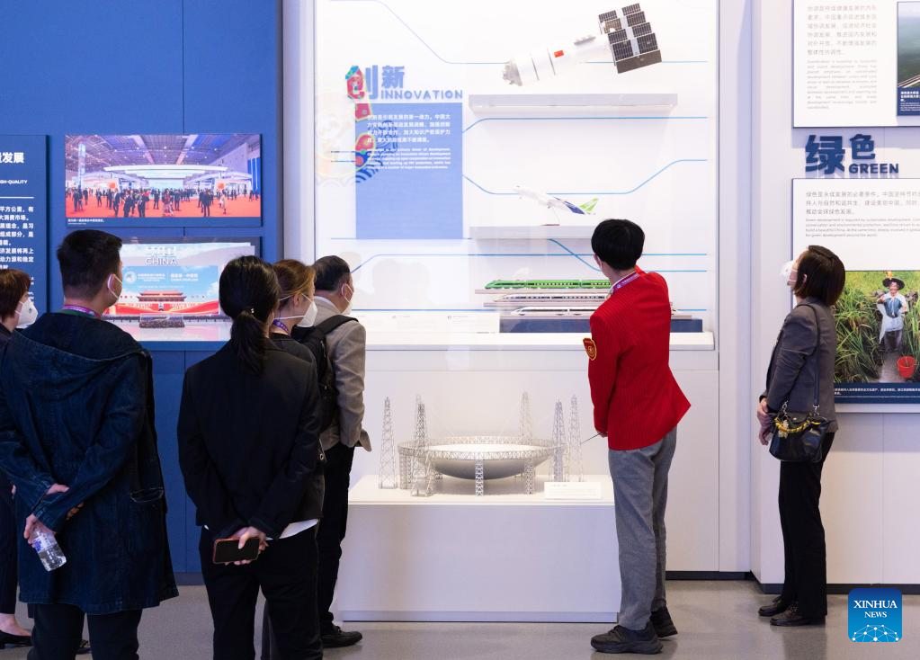 People visit the CIIE Culture Exhibition Hall during the fifth China International Import Expo (CIIE) at the National Exhibition and Convention Center (Shanghai) in east China's Shanghai, Nov. 7, 2022. Located in National Exhibition and Convention Center (Shanghai), the CIIE Culture Exhibition Hall showcases the CIIE's preparation process, highlights and effects, attracting many visitors during the fifth edition of the expo. (Xinhua/Jin Liwang)