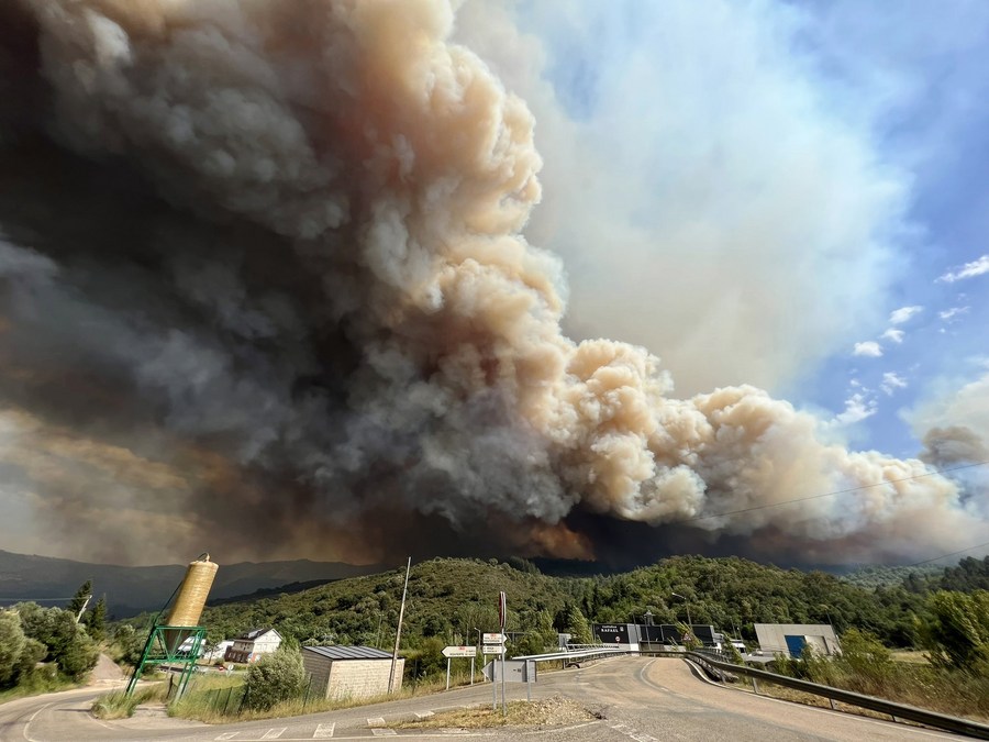 Photo taken on July 20, 2022 shows smoke caused by a wildfire rising in El Barco de Valdeorras, Galicia, Spain. (Junta de Galicia/Handout via Xinhua)
