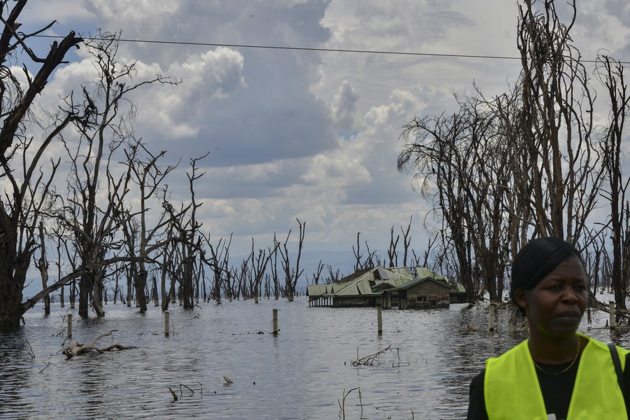 A visitor is seen near a partially submerged building at the former entrance of Lake Nakuru National Park in Nakuru County, Kenya, on Nov. 4, 2022. (Photo by Sheikh Maina/Xinhua)