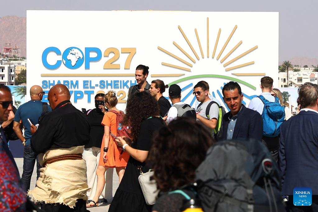 People take selfies with a board showing the ongoing 27th session of the Conference of the Parties (COP27) to the United Nations Framework Convention on Climate Change in Sharm El-Sheikh, Egypt, Nov. 7, 2022. (Xinhua/Ahmed Gomaa)