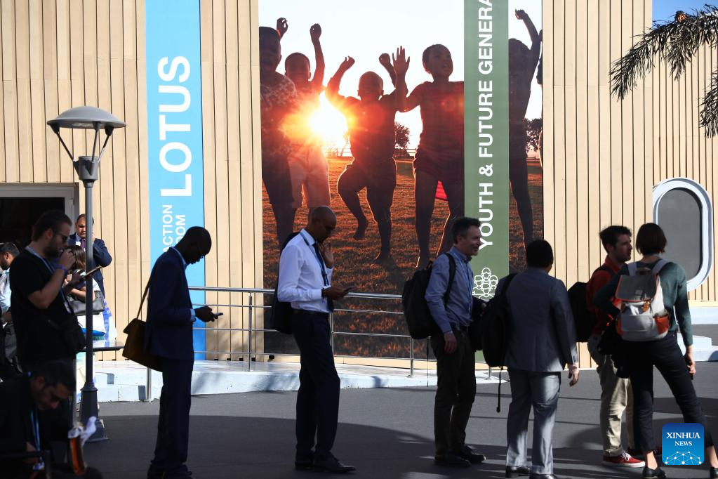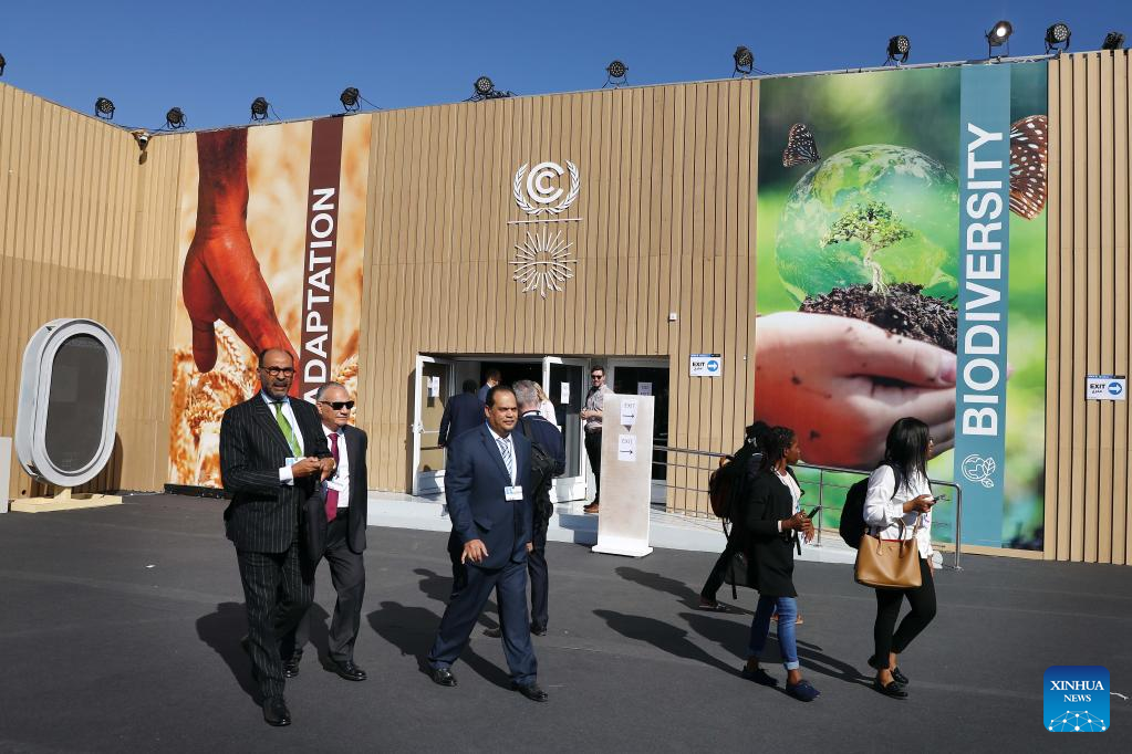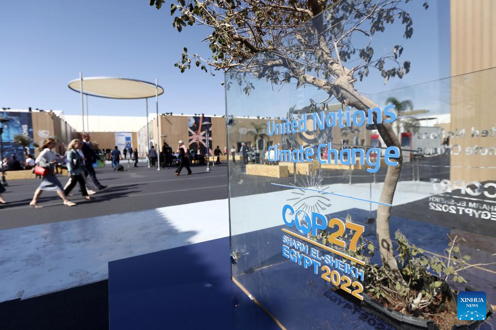 Participants walk past posters during the ongoing 27th session of the Conference of the Parties (COP27) to the United Nations Framework Convention on Climate Change in Sharm El-Sheikh, Egypt, Nov. 7, 2022. (Xinhua/Ahmed Gomaa)
