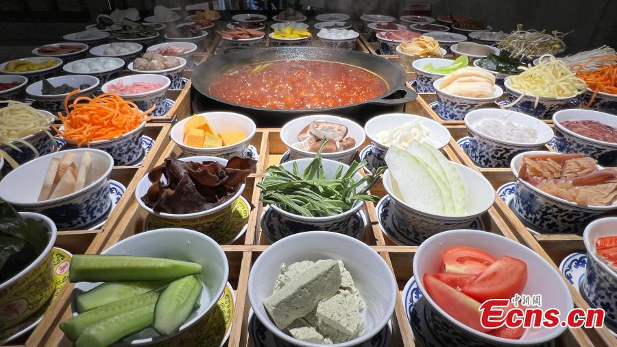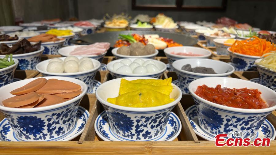 Various dishes are served in traditional Chinese porcelain Gaiwan at a hotpot restaurant, attracting customers in Chongqing, Nov. 7, 2022. (Photo: China News Service/Xiao Jiangchuan)