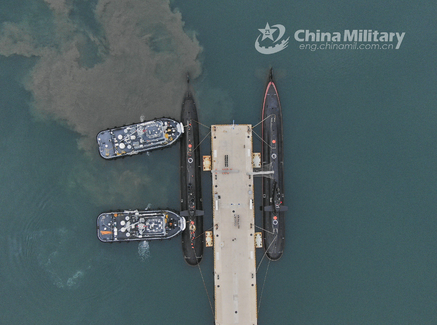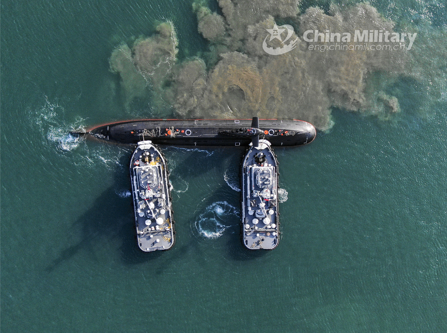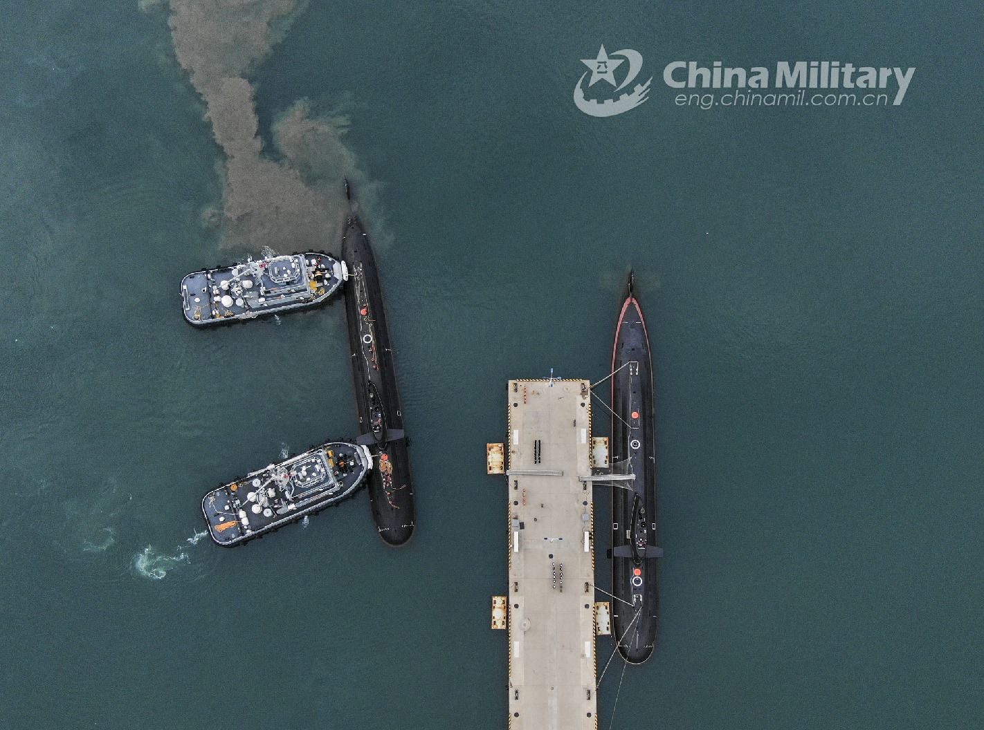 Two towboats attached to a submarine flotilla with the navy under the PLA Northern Theater Command jointly tow a submarine off a dock during a maritime drill on torpedo attack and defense, submarine control, etc. on October 25, 2022. (eng.chinamil.com.cn/Photo by Shi Jialong)