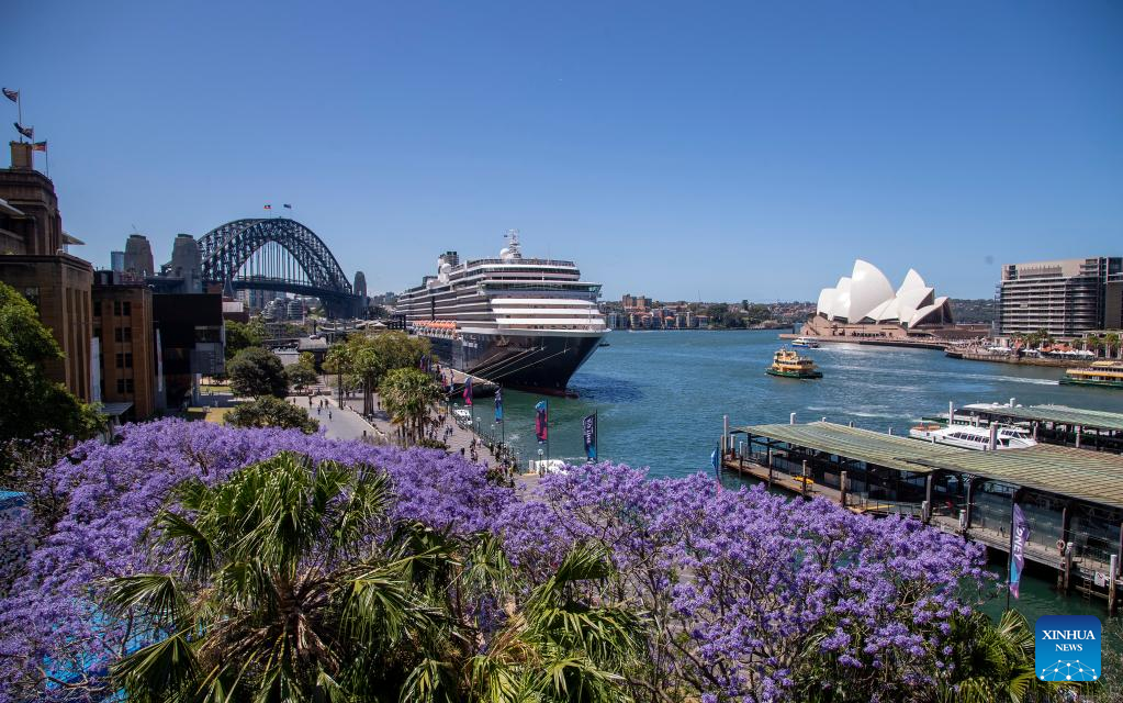 This photo taken on Nov. 7, 2022 shows jacaranda blooms near Sydney Opera House in Sydney, Australia. (Xinhua/Bai Xuefei)