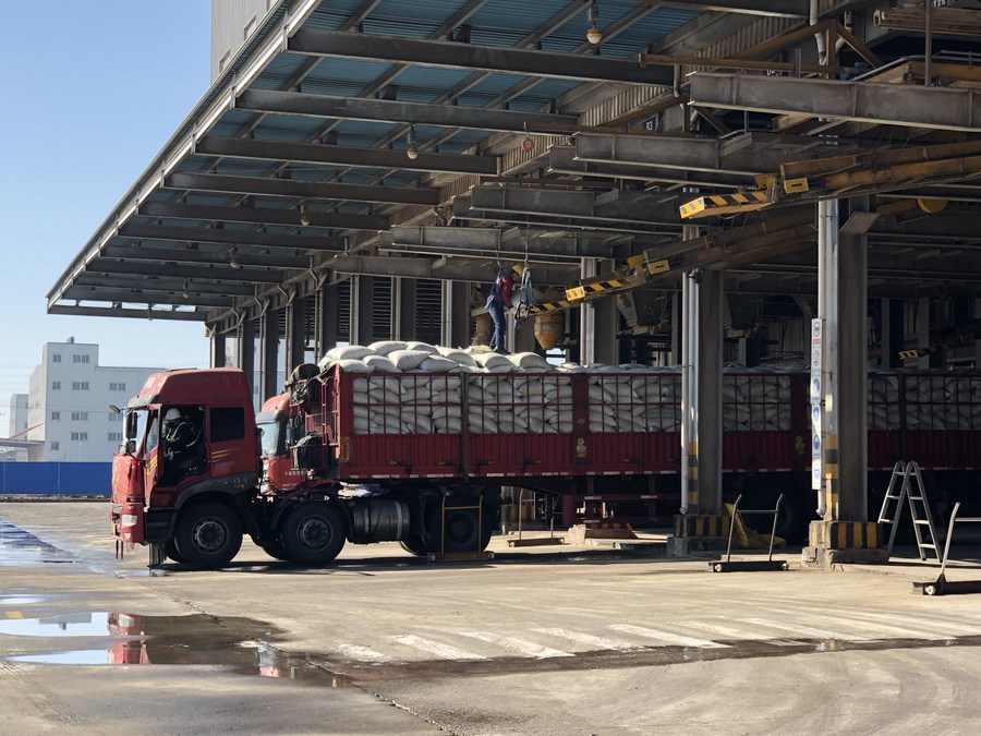 Employees of Louis Dreyfus Company (Tianjin) Food Technology Co., Ltd. load soybean meal onto a truck in north China's Tianjin, Feb. 18, 2020. (Xinhua/Song Rui)