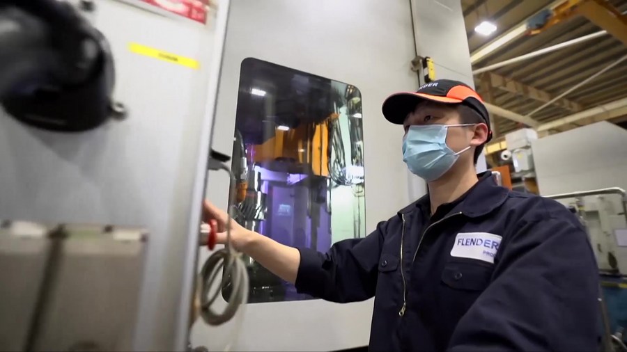 An employee works at a workshop of Tianjin subsidiary of Flender Ltd., China (FLC) in north China's Tianjin, July 29, 2022. (Xinhua/Yang Zichun)