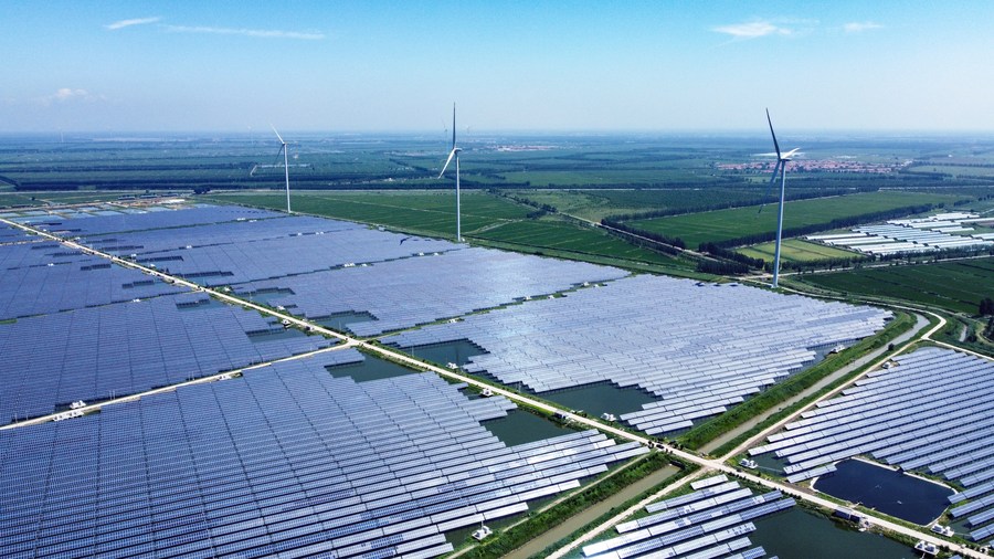 This aerial photo taken on July 18, 2022 shows a photovoltaic power station in north China's Tianjin. (Xinhua/Sun Fanyue)