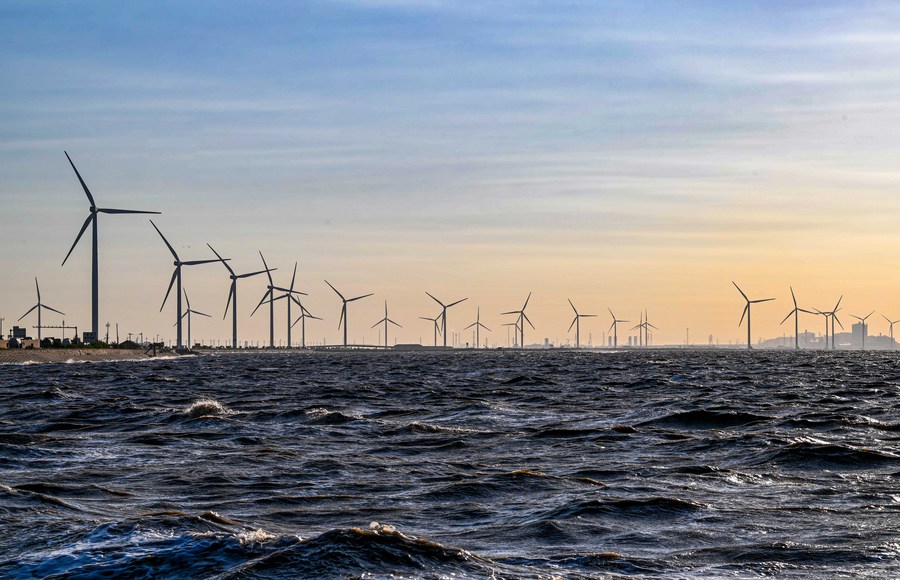 This photo taken on Sept. 1, 2022 shows a wind farm in the Tianjin Binhai New Area in north China's Tianjin. (Xinhua/Sun Fanyue)
