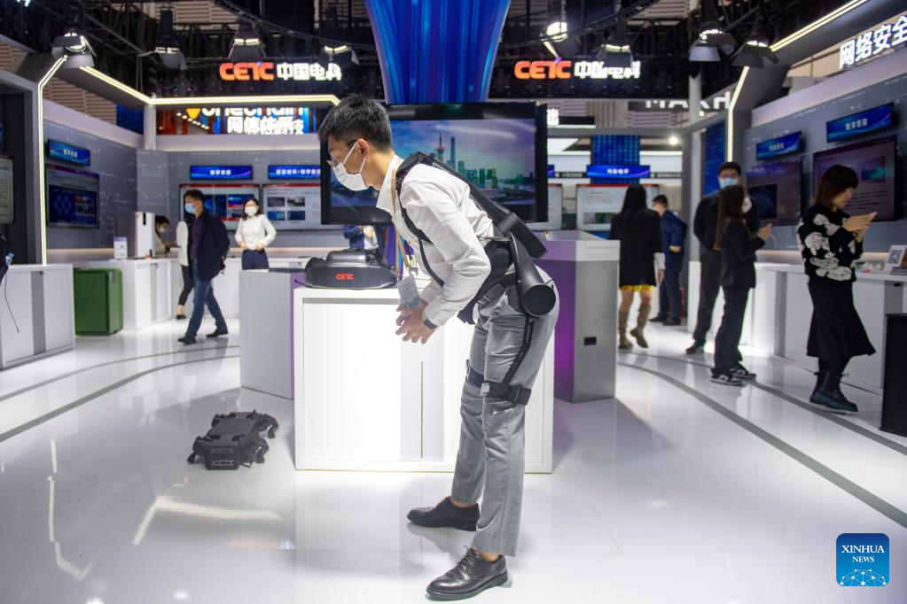 A staff member of China Electronic Technology Group Corporation (CETC) demonstrates a wearable exoskeleton robot during the Light of Internet Expo in Wuzhen, east China's Zhejiang Province, Nov. 8, 2022. The expo kicked off here on Tuesday. (Xinhua/Jiang Han)
