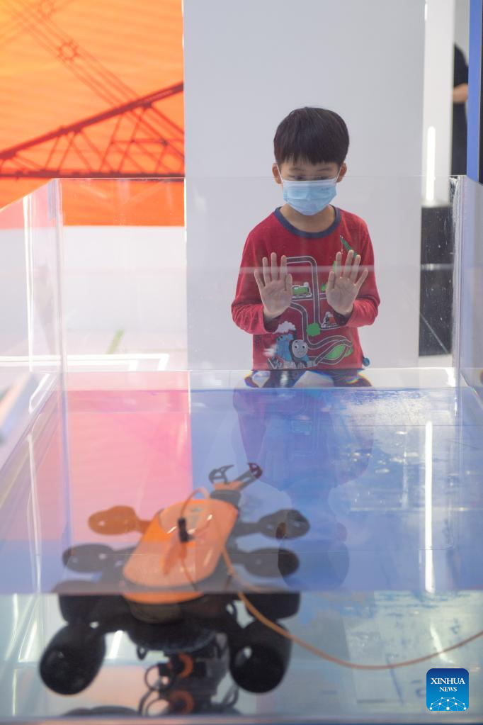 A boy looks at an underwater robot at the booth of China's State Grid during the Light of Internet Expo in Wuzhen, east China's Zhejiang Province, Nov. 8, 2022. The expo kicked off here on Tuesday. (Xinhua/Jiang Han)