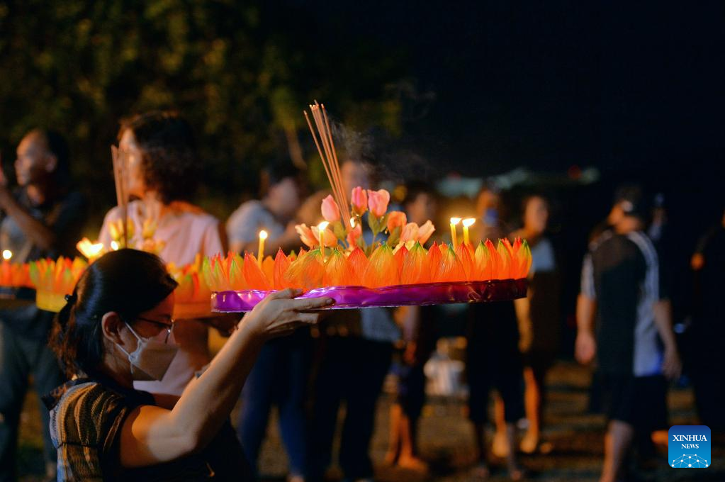 Thai people release water lanterns to celebrate Loy Krathong Festival