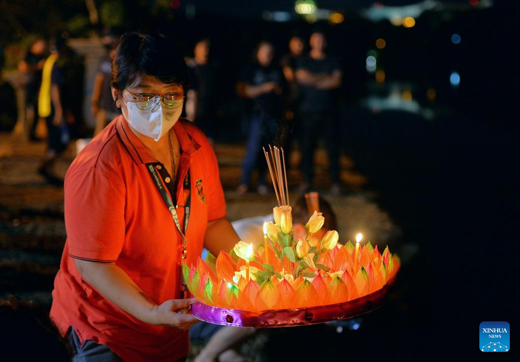 People prepare to release water lanterns in Bandar Seri Begawan, Brunei, on Nov. 8, 2022. The Thailand's traditional Loy Krathong Festival falls on Tuesday this year. Over 100 people including some Thai people living in Brunei released water lanterns for peace and luck. (Photo by Jeffrey Wong/Xinhua)