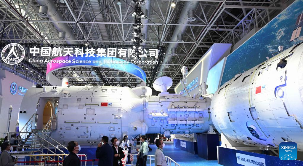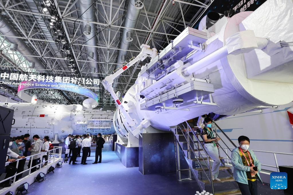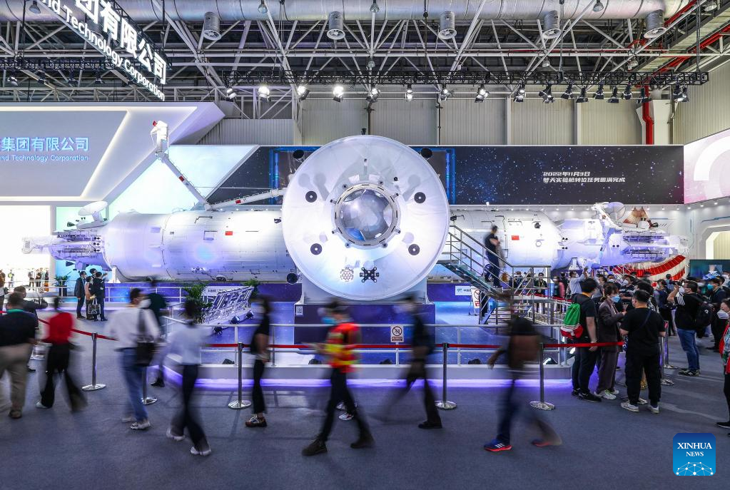 Visitors view the 1:1 model of China's space station combination showcased at the 14th China International Aviation and Aerospace Exhibition in Zhuhai, south China's Guangdong Province, Nov. 8, 2022.
