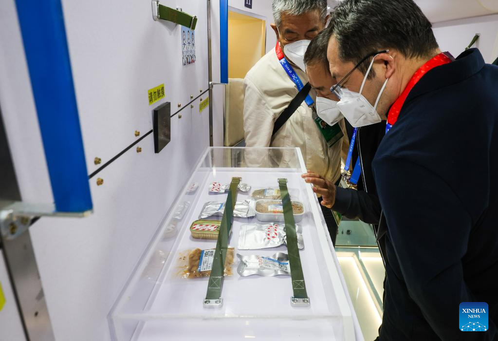Visitors look at food supply for astronauts in the Tianhe core module of the 1:1 model of China's space station combination showcased at the 14th China International Aviation and Aerospace Exhibition in Zhuhai, south China's Guangdong Province, Nov. 9, 2022.