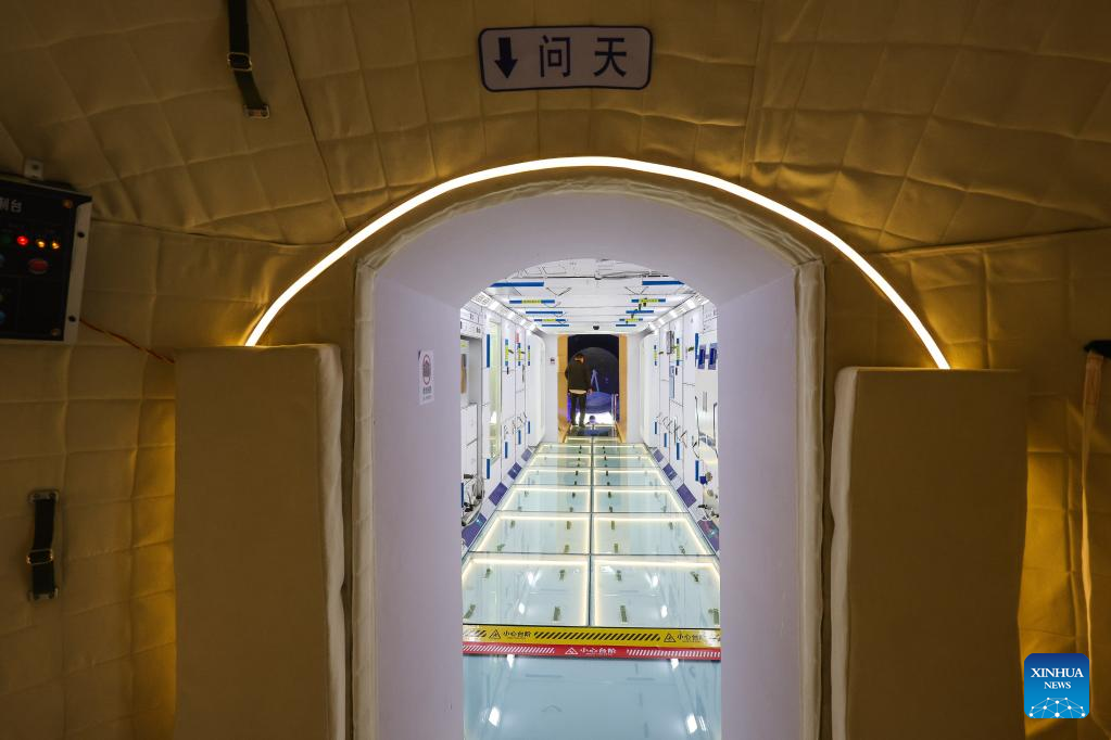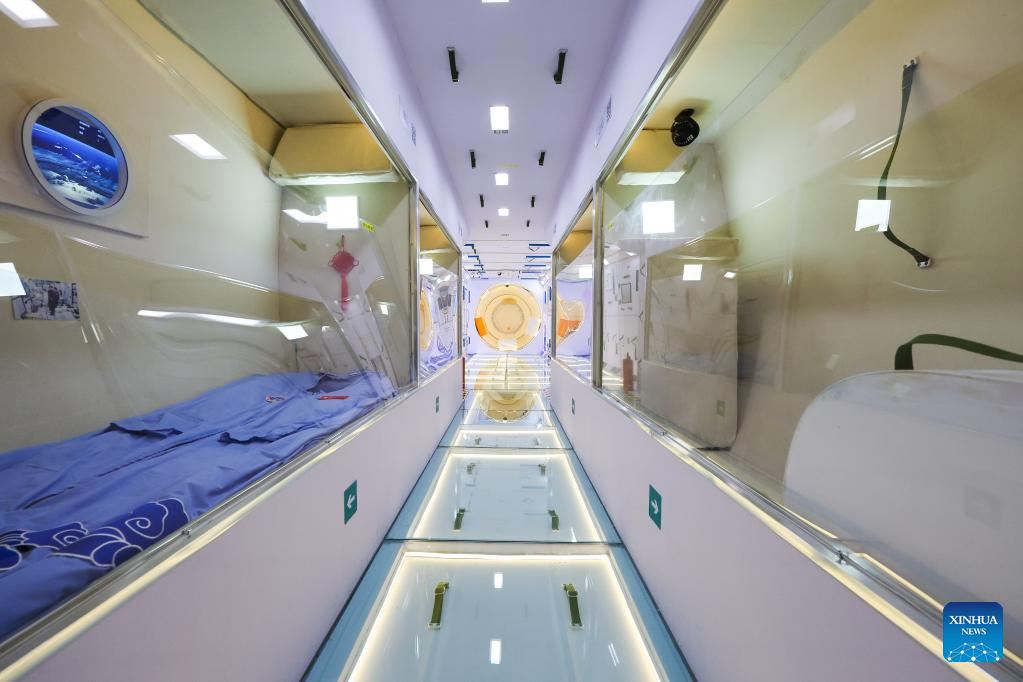 This photo shows an inside view of the 1:1 model of China's space station combination showcased at the 14th China International Aviation and Aerospace Exhibition in Zhuhai, south China's Guangdong Province, Nov. 9, 2022.