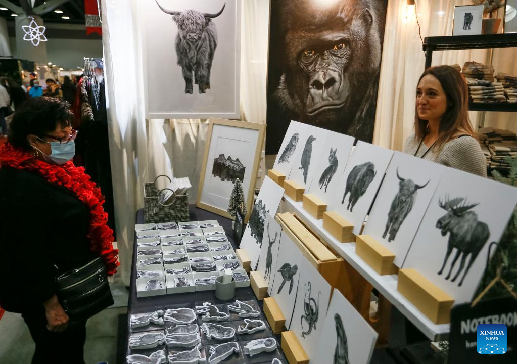 A woman looks at pen-and-ink drawings at the Circle Craft Christmas Market in Vancouver, British Columbia, Canada, on Nov. 9, 2022. (Photo by Liang Sen/Xinhua)