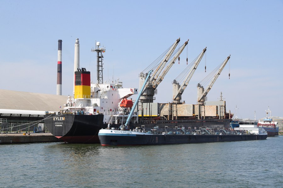 Ships and facilities are seen at the Port of Antwerp-Bruges in Antwerp, Belgium, April 28, 2022. (Xinhua/Zheng Huansong)