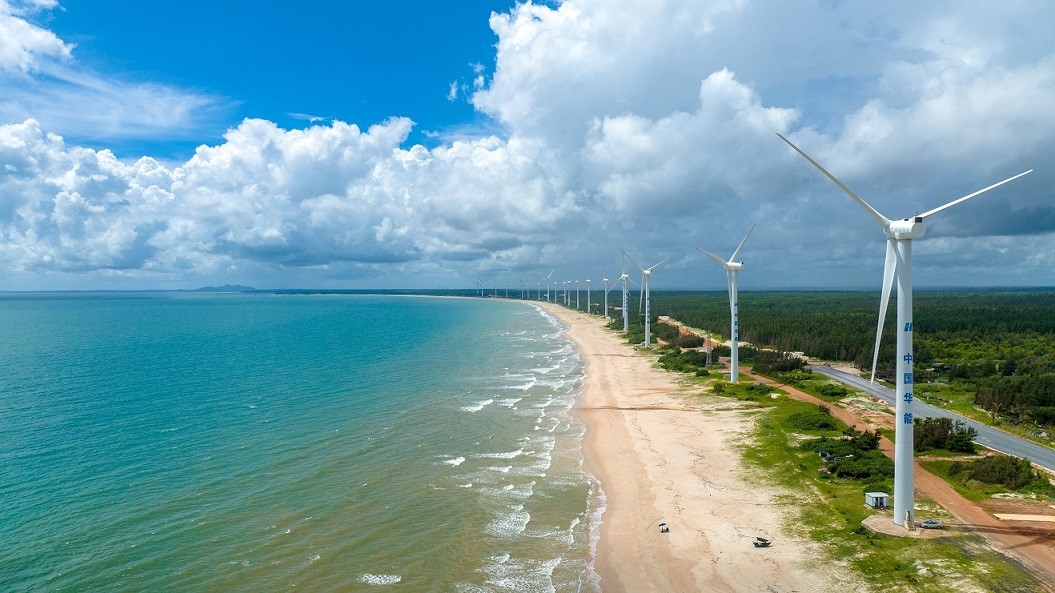 Wind turbines are seen in Mulan Bay of Wenchang, south China's Hainan province, striving for China's "dual carbon" goals, July 2022. (People's Daily Online/Yuan Chen)