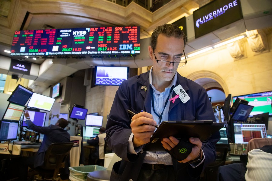 A trader works on the floor of the New York Stock Exchange (NYSE) in New York, the United States, Oct. 7, 2022. (Photo by Michael Nagle/Xinhua)