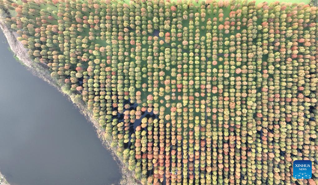 This aerial photo taken on Nov. 9, 2022 shows a metasequoia forest in Luyang Lake wetland park in Yangzhou, east China's Jiangsu Province. (Photo by Meng Delong/Xinhua)