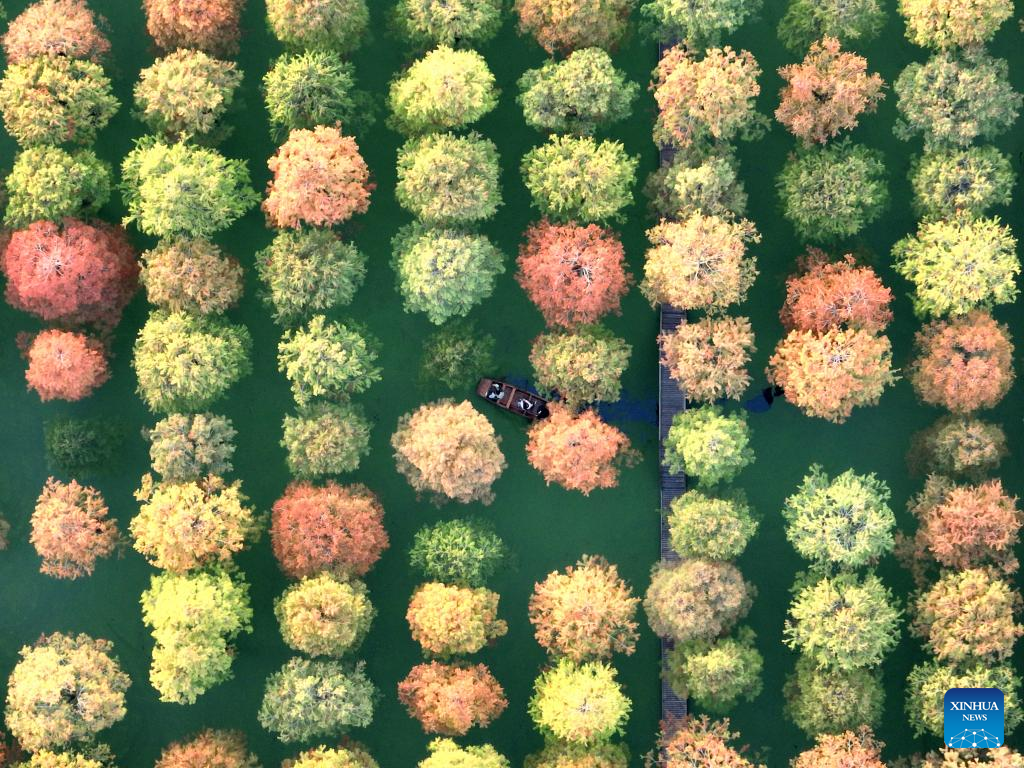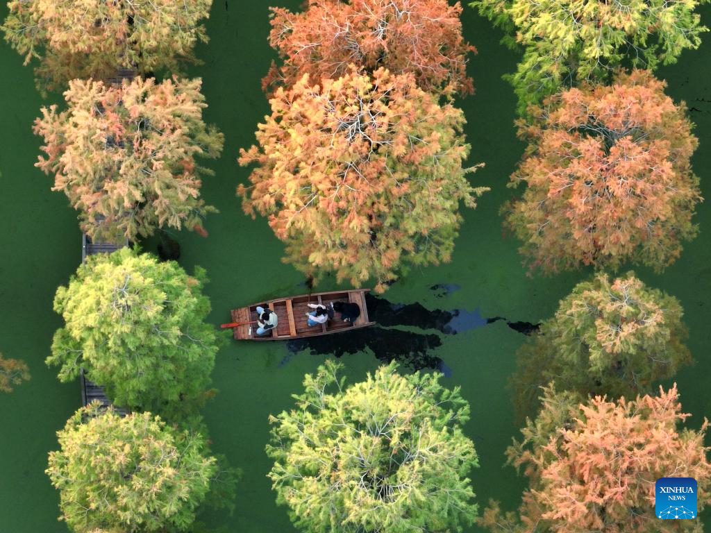 This aerial photo taken on Nov. 9, 2022 shows visitors taking a boat at a metasequoia forest in Luyang Lake wetland park in Yangzhou, east China's Jiangsu Province. (Photo by Meng Delong/Xinhua)