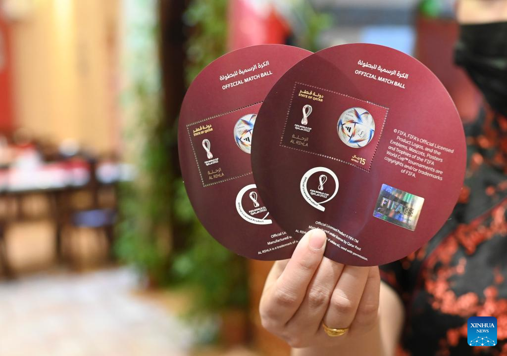 A customer shows the FIFA World Cup Qatar 2022 Official Match Ball stamps in Doha, Qatar, Nov. 10, 2022. (Photo by Nikku/Xinhua)