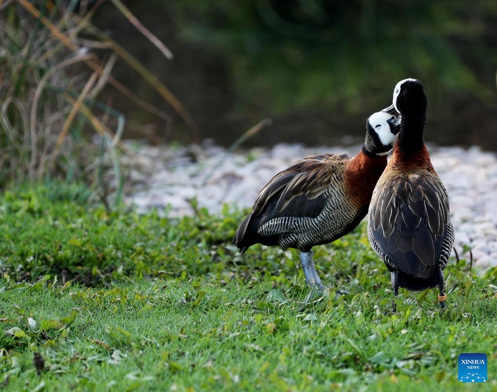 This photo taken on Nov. 9, 2022 shows two white-faced whistling ducks at London Wetland Centre in London, Britain. (Xinhua/Li Ying)